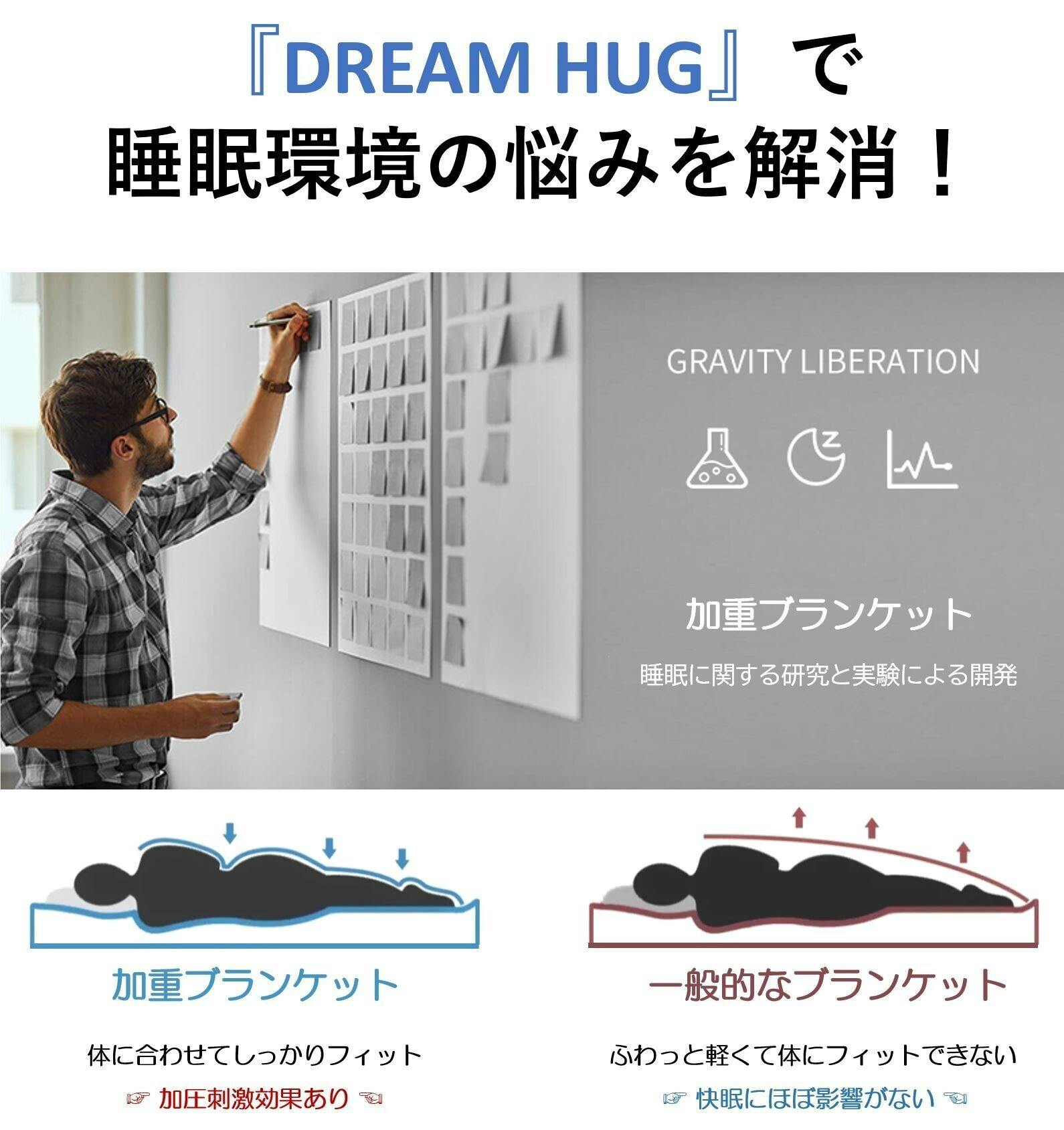 『DREAM HUG』このシリーズのデザインは、消費者調査における加重ブランケットに対する最初の感覚にインスパイアされています。「FEEL LIKE A HUG!」情熱的な抱擁、甘い夢は、私たちが皆様にもたらしたい新しい体験です。 より多く利用シーンに対応するために、両面デザインを採用し、異なる素材を組み合わせることで、「スーパーソフトクリスタルベルベットと竹繊維」を使用した「DREAM HUG」シリーズ加重ブランケットを開発しました。
