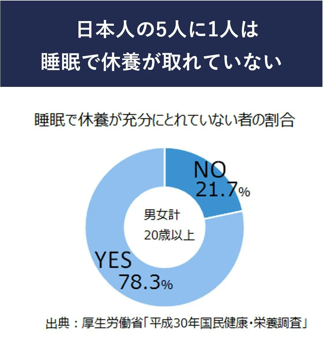厚労省の調査により、日本人の21.7%が慢性的な睡眠課題を訴えており、睡眠で休養がしっかりとれていないと感じる方が多いようです。日本国内では約2600万人が睡眠のお悩みを抱えていることになりますが、あなたは大丈夫ですか?
