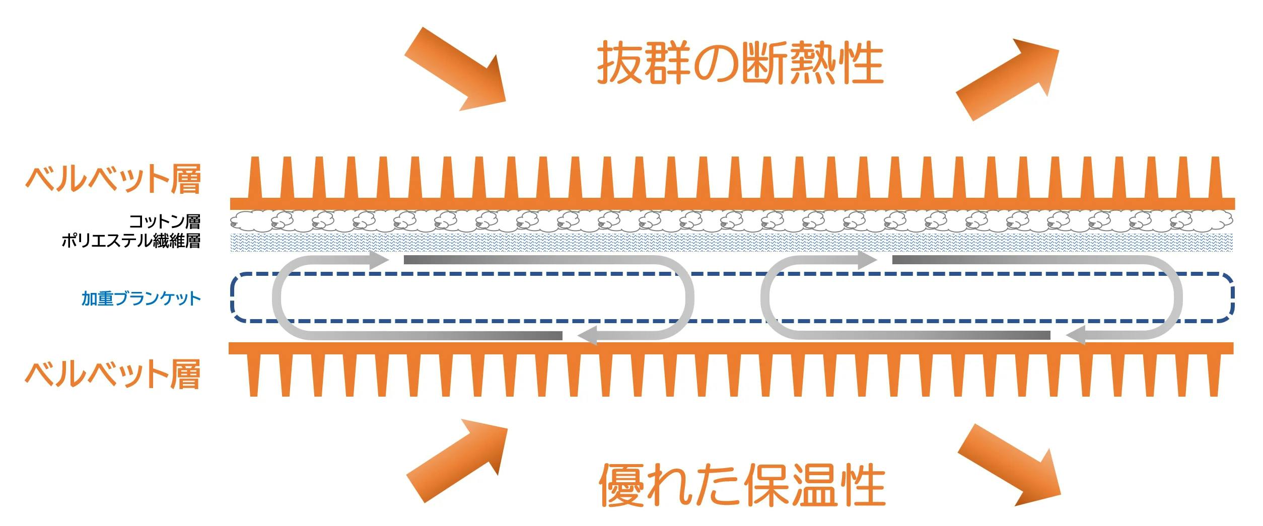 B面(ベルベット面)を利用する場合は、毛羽のふわふわとしたやわらかな肌触りで、保温性に優れて、朝まで暖かく眠れます。