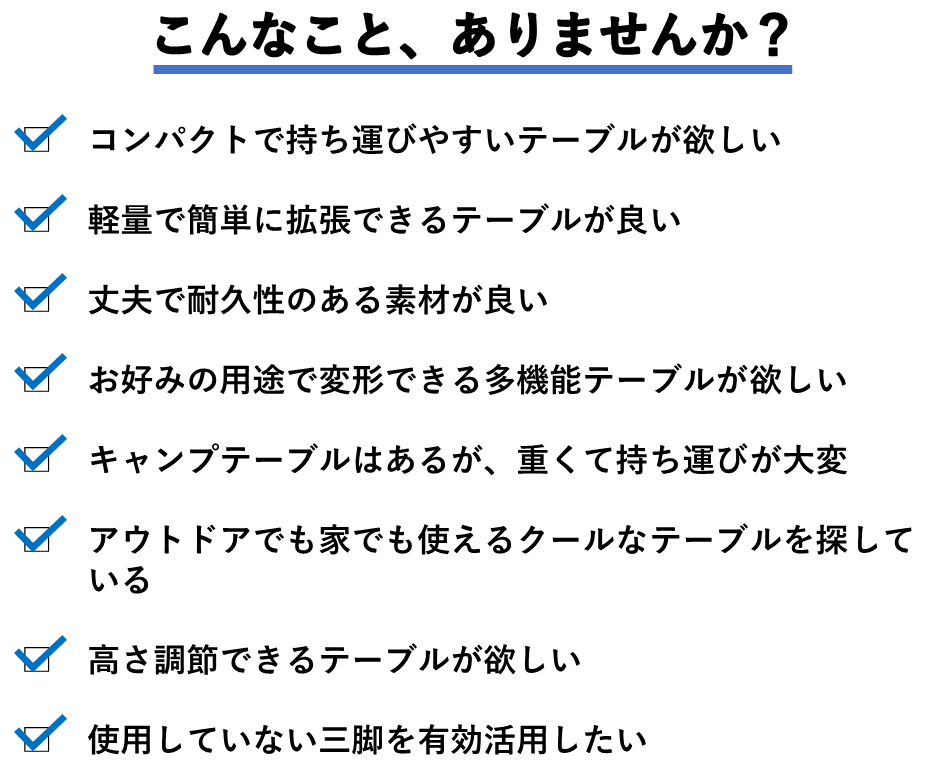 アウトドアテーブルのギアは、高強度・軽さ・携帯性・拡張性の4拍子揃った機能的な作りとなっています。初心者の方で使いやすい粘度で、高い操作性を誇ります。なのにしっかりとした強度もあるので、初心者からプロまで多くの方にご愛用されております。皆さまから頂いたご意見等を参考しながら、商品の改善や向上、魅力あるアウトドアテーブルに反映してまいります。